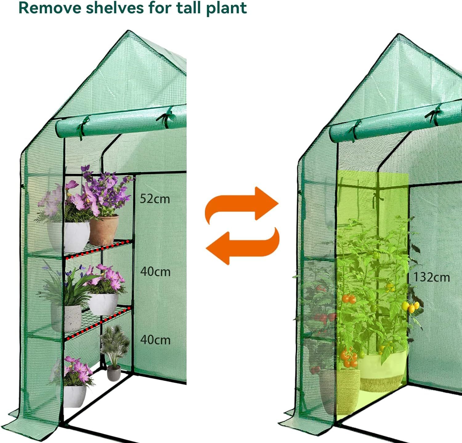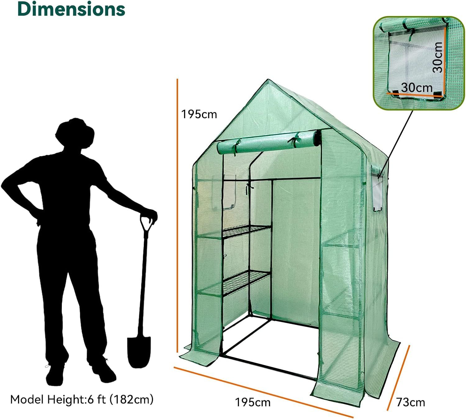 2.Roomer Walk-in Greenhouse : Constructed with 6 wired shelves – 3 on each side, and measures 143 (L) x 73(W) x 195(H)cm, which makes large walking space for all your blooming flowers, sprouting plants and fresh vegetables.