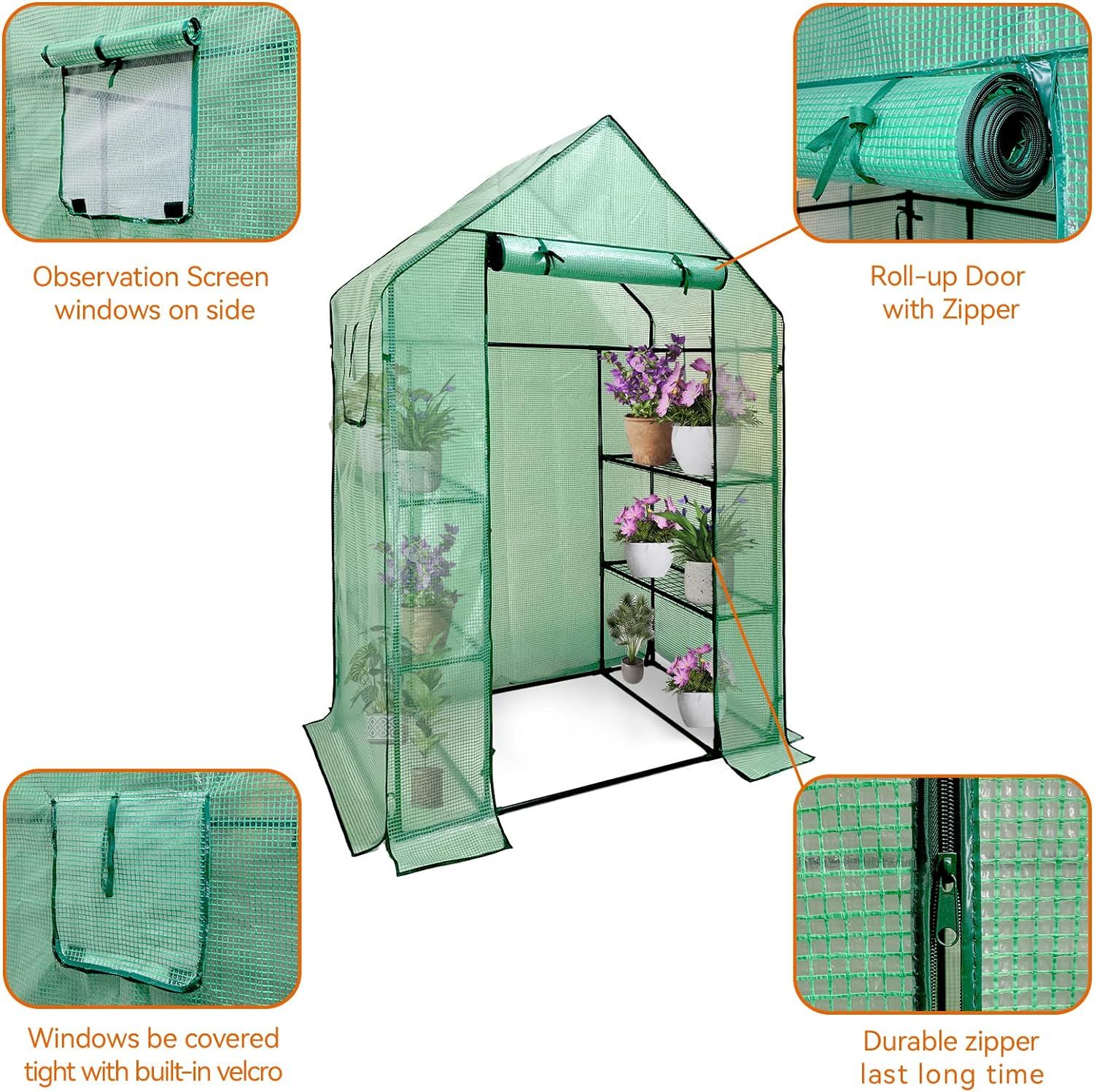 1.Better Enviroment for Plants: The greenhouse with PE door and windows is designed with a zippered roll-up PE door and 2 velcro side roll up windows on both side,for easy access and screened ventilation for keep the plants warm and provide better air circulation for the plants. Keep small animals out, and works as observation window that makes it easy to peek inside.