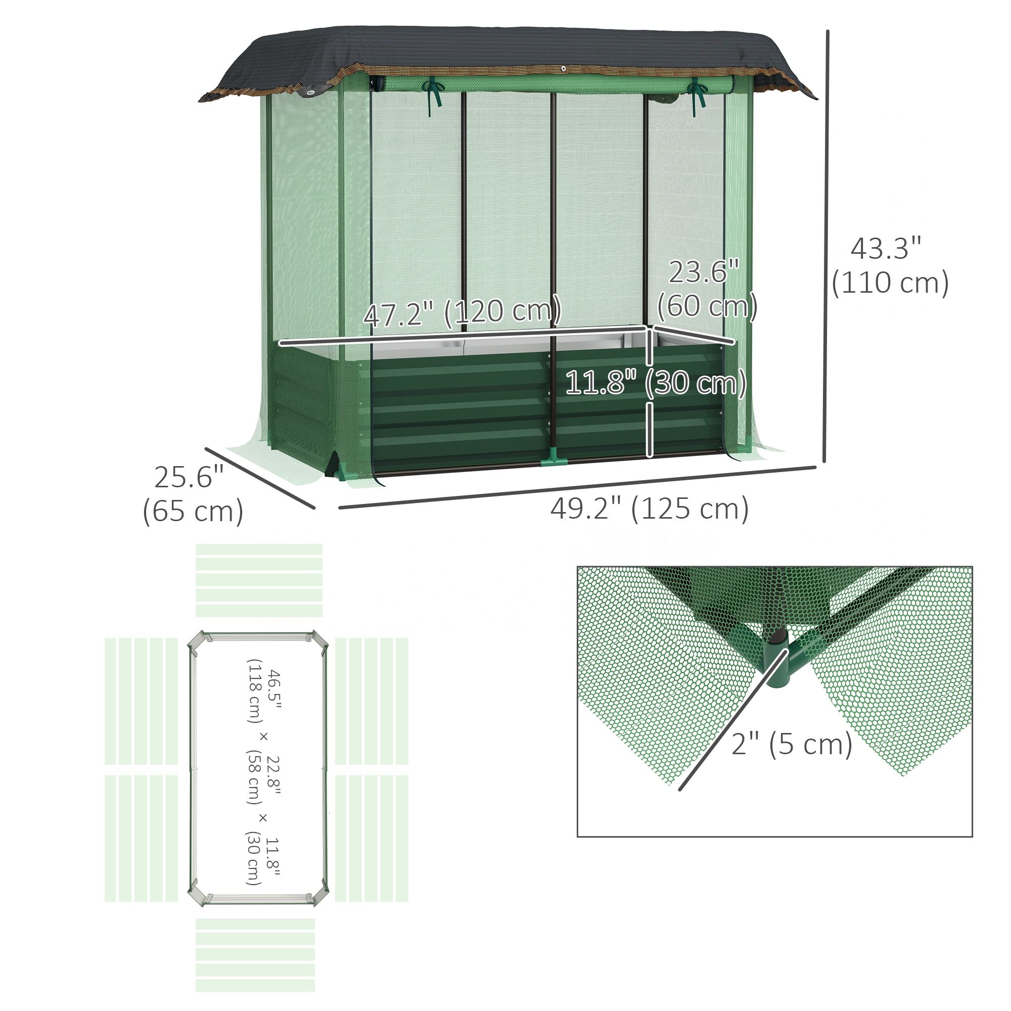 • Overall Dimensions: 49.2" W x 25.6" D x 43.3" H (125 x 65 x 110 cm), Garden Bed Size: 47.2" W x 23.6" D x 11.8" H (120 x 60 x 30 cm), Crop Cage Size: 49.2" W x 25.6" D x 43.3" H (125 x 65 x 110 cm), Shade Cloth Size: 63" W x 39.4" D (160 x 100 cm).