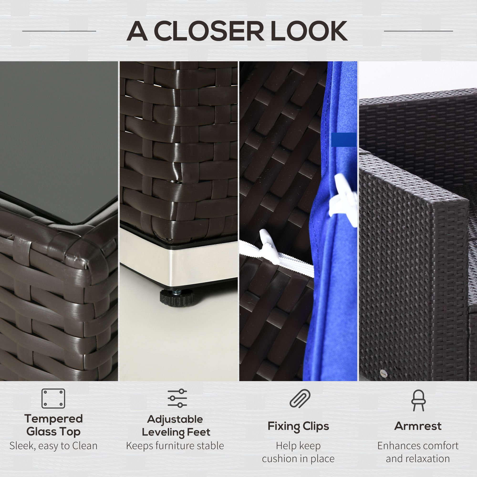 • Easy Maintenance: Features washable cushion covers and a tempered glass table top, making it simple to clean and maintain, ensuring your outdoor space remains pristine.