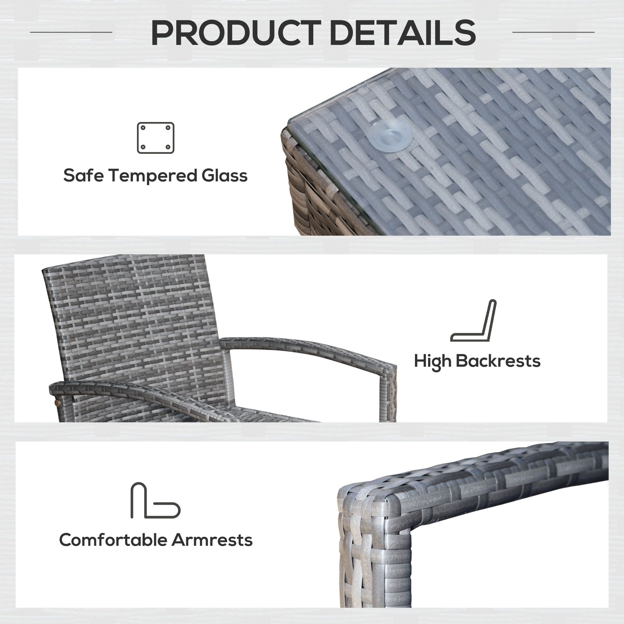 • Absolute Relaxation: This rattan bistro set is ergonomically designed for extra comfort, with soft seat cushion for supreme comfort.
